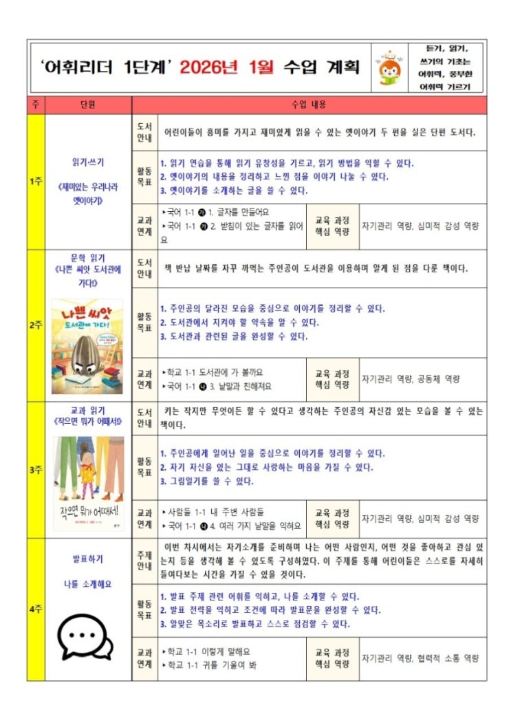 1월 한우리 수업계획/옥계독서논술/해마루초한우리