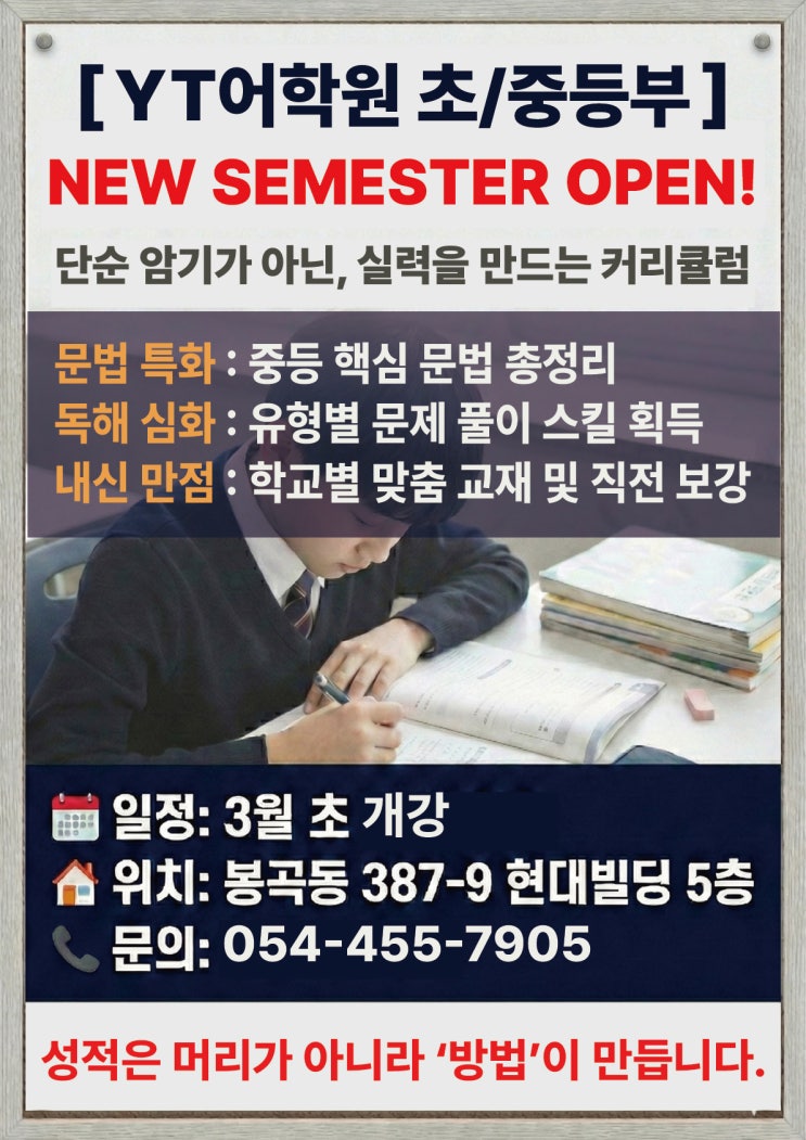 안녕하세요, **봉곡동 영어 교육의 중심 [YT어학원]**입니다. 새 학기를 앞두고 우리 아이 영어 공부, 어디서부터 어떻게 시작해야 할지 고민 많으시죠? "초등 때는 재밌게만 하면 될까?" "중등 내신은 어떻게 대비해야 하지?" YT어학원은 이 모든 고민에 대한 명확한 해답을 가지고 있습니다. **초등의 기초가 중등의 성적으로 이어지는 YT만의 '성공 방정식'**을 소개합니다. 1단계. [초등부] 기초는 탄탄하게, 입은 자유롭게! 초등 영어의 핵심은 '거부감 없는 시작'과 '정확한 발화'입니다. YT는 아이들의 단계에 맞춰 교재를 이원화하여 운영합니다. Phonics반: 스토리북(Story Boo....... <img src="https://blogthumb.pstatic.net/MjAyNjAyMTNfMjU3/MDAxNzcwOTcwNTUzOTA3.JCcl8eBLQBlQ3w9ycNELVe0YLVNG7YumBTZDIxoTnYsg.OJaN9nO1TvfBz0YTaTnCo6bVaqaL6AC_efiqO5TeRk8g.JPEG/%C1%DF%B5%EE%BA%CE%B1%A4%B0%ED.jpg?type=s3" />