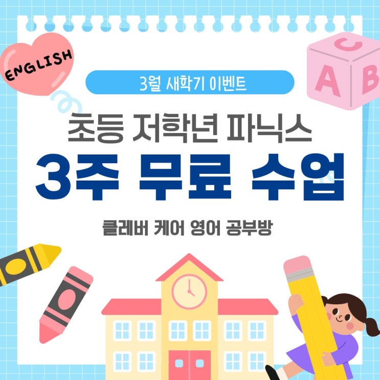 안녕하세요! 고촌 캐슬앤파밀리에시티 1단지에 위치한 클레버 케어 영어 공부방입니다. 3월 새학기를 맞이해서 <파닉스 기초반> 3주 무료 수업 이벤트를 하는 중입니다. 영어 읽기의 시작은 파닉스입니다. 처음 영어를 접하는 아이들이 단어의 소리 규칙을 제대로 익히지 못하면 이후 단어 읽기와 문장 이해에서 어려움을 겪을 수 있습니다. 이번에 <파닉스 기초반> 3주 무료 수업을 통해 아이가 음가 읽기에 자신감을 가질 수 있도록 도와드립니다. ✅ 수업 대상 영어를 처음 시작하는 초등 저학년 알파벳은 알지만 대/소문자 구별을 못하는 아이 기초 단어 (자음-모음-자음) 읽기에 어려움이 있는 아이 ✅ 수업 시간 3월 10일 화요....... <img src="https://blogthumb.pstatic.net/MjAyNjAyMTdfMTg4/MDAxNzcxMjg3NDcxMzA4.iAck69xVtH9lLTrkG7VTw1jY0lHpZqSRZdtbenNliUwg.5pk59E4Oa0kzPvi0Tquzg37J44FJKA3jz0L6GTT4yA4g.JPEG/%C6%C4%B4%D0%BD%BA_%B9%AB%B7%E1.jpg?type=s3" />