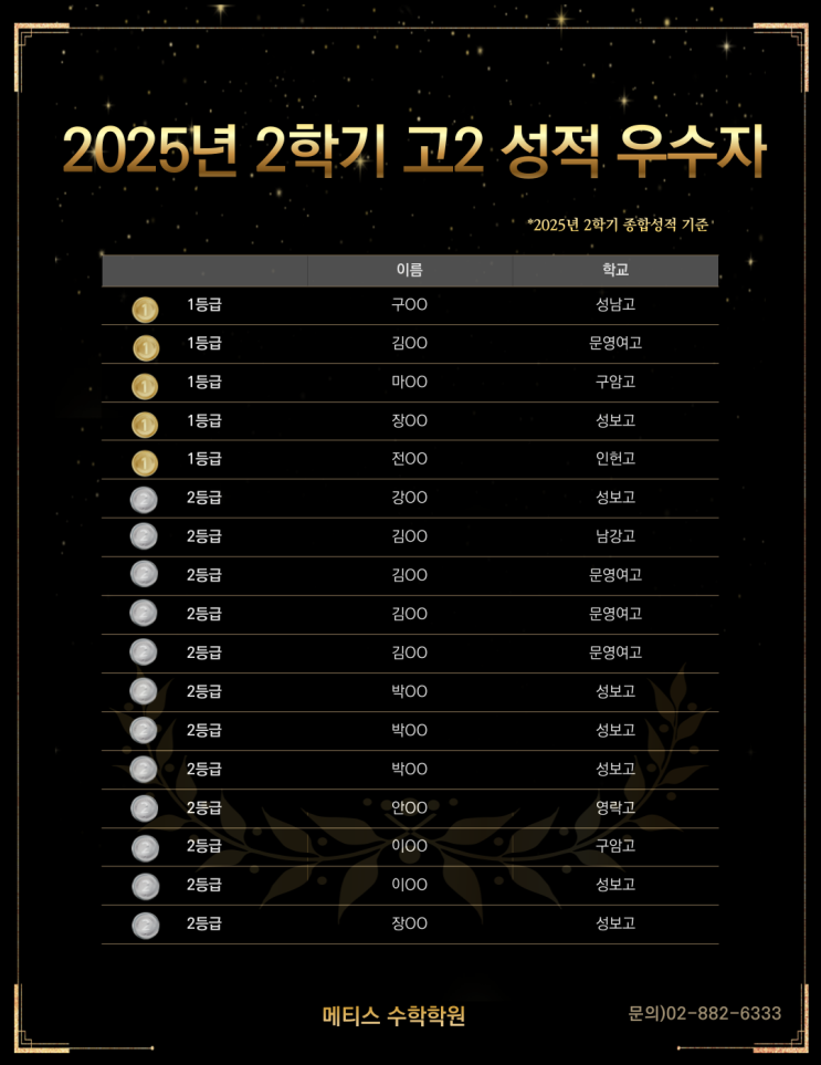 관악구 수학 메티스수학 2025년 2학기 고2 내신성적 우수자