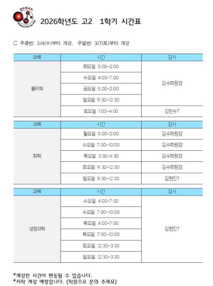 2026 중등부 정규과학반 개강 (중1~중3)