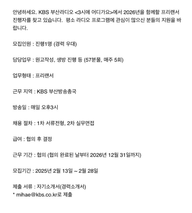 KBS부산 라디오 프리랜서 진행자 모집