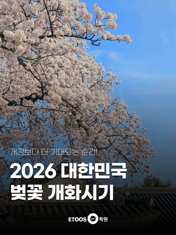 안녕하세요, 이투스247학원 공식 블로그입니다! 다들 설 명절은 잘 보내셨을까요? 2월 황금연휴였던 설날을 뒤로하고 다음 기대되는 일정을 알아왔는데요! 바로바로 벚 꽃 개 화 시 기 2026년 벚꽃 개화시기는 물론, 국내 벚꽃 축제와 대학교 벚꽃 명소 추천까지 지금 바로 확인하시죠! 2026 대한민국 벚꽃 개화시기 2026년 벚꽃 개화시기는 올해도 역시 2~3일 정도 빨라질 것으로 예상되고 있는데요! 서울, 경기, 인천, 대전, 충청 등의 벚꽃 개화시기는 2026. 3. 30(월) ~ 4. 7(화) 강원도는 2026. 4. 5(일) ~ 4월. 10(금) 전후, 대구, 경주, 진주 등 영남 내륙은 2026. 3. 28(토) ~ 4월 초, 광주, 전주, 순천, 담양 등 호남 내륙은 2026........ <img src="https://blogthumb.pstatic.net/MjAyNjAyMTlfMjY0/MDAxNzcxNDgxOTcyNzY2.Wr59xBdD9RUKKd0huC63jTb6os-JBsoe6Pf-cmJDOyEg.tRb84kIKQ3cqWxEiIKl93lvggXk5CQ2NjIyJW9CxgNgg.PNG/1.png?type=s3" />