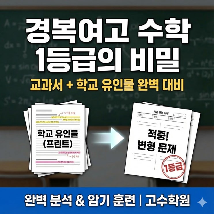 이제 곧 고등학교 배정이 발표되고 예비 고1 학생들과 학부모님들의 긴장감이 최고조에 달할 시기입니다. 특히 경복여고에 배정받을 확률이 높거나 지원한 학생이라면 지금 당장 수학 공부의 방향성을 점검해야 합니다. 많은 분들이 "고등 수학은 미리 진도를 나가야한다" "심화 문제를 많이 풀어야 한다"고 걱정하십니다. 하지만 경복여고 내신 시험의 성패는 조금 다른 곳에 있습니다. 단도직입적으로 말씀드립니다. 경복여고 수학 시험은 '학교에서 나눠준 유인물'을 얼마나 완벽하게 소화했느냐에서 등급이 갈립니다. 풀 줄 아는 것 vs 시험장에서 맞히는 것의 차이 경복여고 시험지를 분석해 보면 킬러 문항....... <img src="https://blogthumb.pstatic.net/MjAyNjAxMDNfOSAg/MDAxNzY3NDIxNTU4NTI1.g33xJMVCI1lJoCjrhBrQ_UlQXTBwILO8Yci5Hz2c6ZUg.UOuS_YZgTTDMpz-vUMWmzxafxGLLIlHbRAqCTQfCa1gg.JPEG/unnamed.jpg?type=s3" />