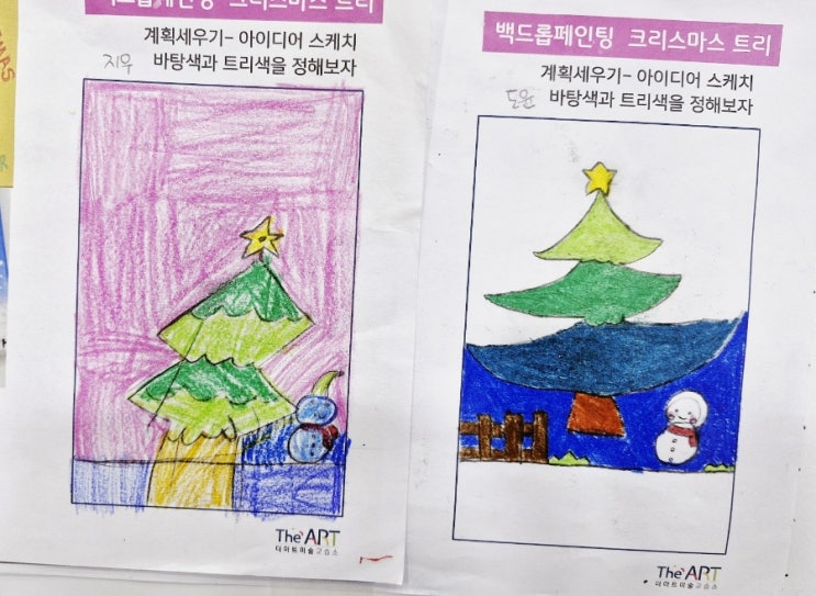 "백드로페인팅으로 완성한 반전 매력 크리스마스 트리" 수업에서는 '백드로페인팅(Backdrop Painting)' 기법을 활용하여 크리스마스 트리를 그려보았습니다. 백드로페인팅은 캔버스 뒷면에서 색과 모양을 표현하는 독특한 기법으로, 아이들이 색의 조합과 질감 변화를 자연스럽게 경험할 수 있습니다. 먼저 캔버스와 같은 크기 종이위에 아이디어스케치부터 해보기 트리나무 모양과 색 바탕색등을 미리 그려서 색의 조화도 생각해본다 나이프로 쓱쓱 바탕을 칠하기 색도 나무모양도 다양하네! 생각이 다른 더아트 아이들. 클레이로 만든 눈사람과 선물 장식도 더해 따뜻하고 즐거운 분위기를 만들었어요. 이 과정에서 아이들....... <img src="https://blogthumb.pstatic.net/MjAyNTEyMTlfMTI2/MDAxNzY2MTI3MjI1Mjky.dZdoo7d147BV3lk4Bt1f4hDycLMretMvU_e4F5YFsPwg.qYNnPDNSgo9hPHpD2u05yZziJyQuDiCZfvsRKGFwTkcg.JPEG/900%A3%DF1766127224056.jpg?type=s3" />