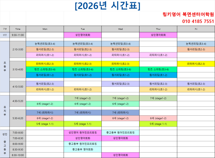 2026년 링키영어 북면센터어학원 시간표 안내 & 신입 원생 모집