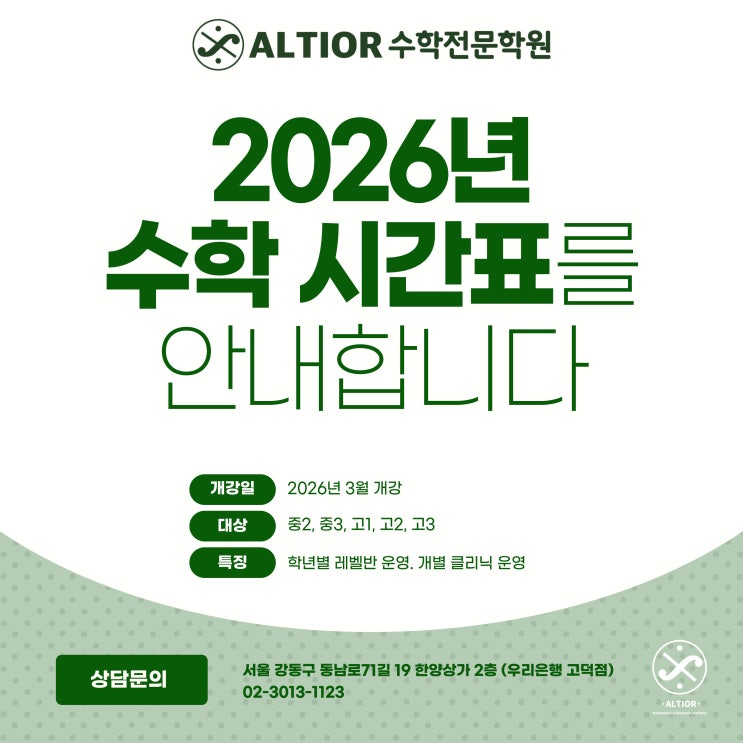 2026년 ALTIOR수학전문학원 수학과 시간표 안내 3월 순차 개강 고1 1학기 중간고사 내신대비 시간표 고2 1학기 중간고사 내신대비 시간표 고3 1학기 중간고사 내신 및 수능대비 시간표 중등 수학 중2 & 중3 시간표 * 입반시 레벨테스트 필요 (2학기 중간고사 내신시험지로 입반 상담 가능 - 학원문의) * 정규시간표 외 클리닉 별도운영 (담당선생님과 개별일정상담) 더 높게, 더 깊이, 수학의 기준을 높이다. ALTIOR 수학전문학원 (한양아파트 앞 한양상가, 우리은행 2층) 문의. 02-3013-1123 <img src="https://blogthumb.pstatic.net/MjAyNjAyMjBfMTAg/MDAxNzcxNTkxMTAwMDk3.ZGIQWJ1zPyI2swNuMzWiqOroaOkJn887zQzamNP0ieUg.Oh411SD2PHEikiOotcgmWZlOou_MYAl8FHuCMUtTO1Ug.JPEG/001.jpg?type=s3" />