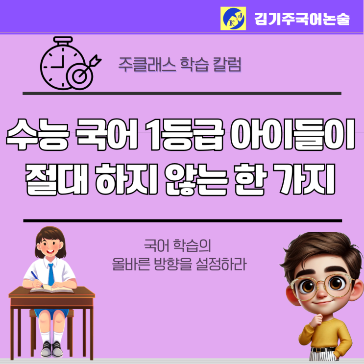 안녕하세요. 국어 학습의 올바른 방향을 잡아드리는 김기주 국어(주클래스)의 ' 김 원장입니다. ^^ 수능 국어와 관련해 학생을 처음 상담할 때마다 저는 아래와 같은 질문을 던집니다. “이 문제, 왜 이 답을 골랐어?” 이 질문에 대한 반응은 성적에 따라 놀라울 정도로 분명하게 갈립니다. 하위권 학생들은 잠시 머뭇거리다가 이렇게 말합니다. “그냥… 느낌이요.” “보기에 이게 제일 맞는 것 같았어요.” 반면 수능 국어 1등급 학생들은 대답이 다릅니다. 빠르지도 않고, 길지도 않습니다. 하지만 한 가지 공통점이 있습니다. 답을 고른 이유가 이미 정리돼 있다는 점입니다. 많은 사람들은 착각합니다. 수능 국어 1등급은 글을 빨리....... <img src="https://blogthumb.pstatic.net/MjAyNjAxMDhfNDQg/MDAxNzY3ODM4MDc3NTEy.S1dlp_He3o9mOiakXfig1qZeq1zYZMFU82jo_8tG4nUg.skswvkyZY-eM3evKiqYmKvLTEhseZDmPcjD39yuK1rEg.PNG/%C6%C4%B6%F5%BB%F6%B0%FA_%C8%B8%BB%F6_%BD%C9%C7%C3%C7%CF%B0%ED_%B1%F2%B2%FB%C7%D1_%BA%F1%C1%EE%B4%CF%BD%BA_%C4%AB%B5%E5%B4%BA%BD%BA_%C0%DB%BC%BA_%BF%E4%B7%C9_%BE%C8%B3%BB_%B5%F0%C0%DA%C0%CE_%C5%DB%C7%C3%B8%B4_%C0%CE%BD%BA%C5%B8%B1%D7%B7%A5_%C6%F7%BD%BA%C6%AE%C0%C7_%BB%E7%BA%BB_%2838%29.png?type=s3" />