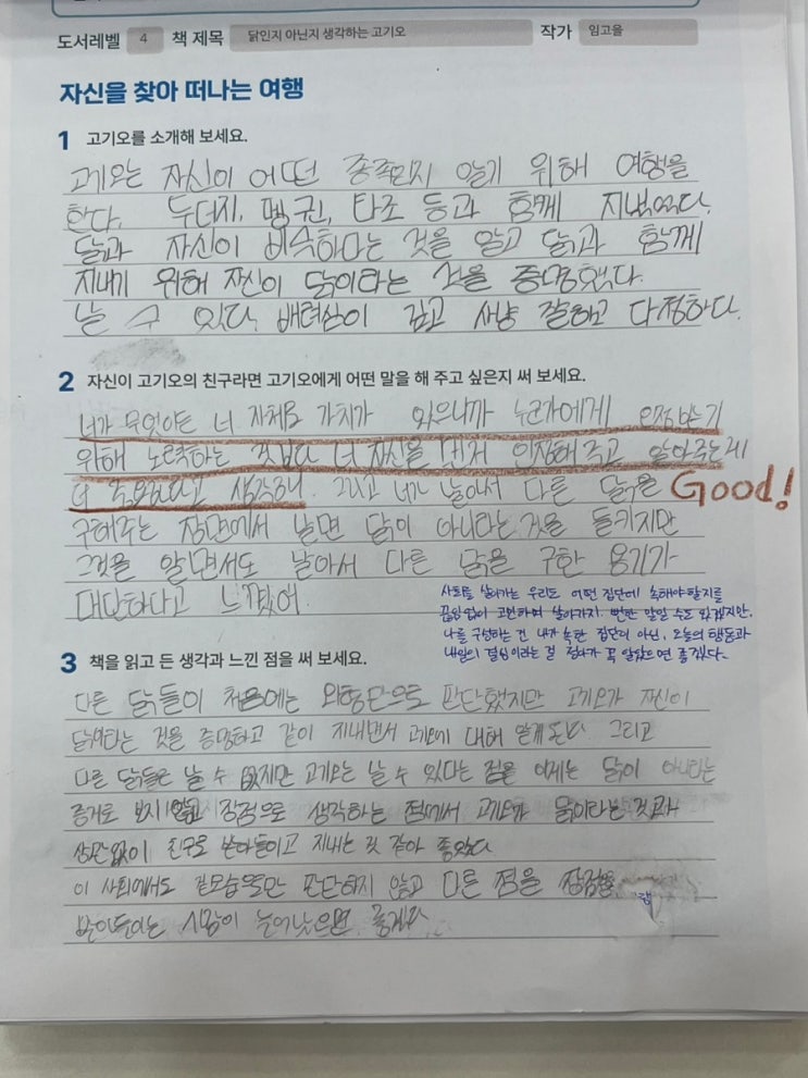 안녕하세요, 대조기찬 리드인입니다. 오늘은 수업 시가에 아이들이 책을 읽고 작성한 독서 활동지 중 마음을 울렸던 문장 몇 개를 소개해 보려고 합니다. 짧은 문장에도 아이들의 생각과 감정이 고스란히 담겨 있답니다^_^ "네가 무엇이든 너 자체로 가치가 있으니까 누군가에게 인정받기 위해 노력하는 것보다 너 자신을 먼저 인정해 주고 알아주는 게 더 중요하다고 생각해." 이 친구는 <닭인지 아닌지 생각하는 고기오>를 읽고, '타인의 시선'보다 '자기 인식'이 중요하다는 생각을 활동지에 담아줬어요. 누구나 무리에 속하고 싶어 애쓴 경험이 있지만, 결국 '나 자신'을 알아가는 과정이 가....... <img src="https://blogthumb.pstatic.net/MjAyNjAyMDRfMTIz/MDAxNzcwMTg1NDg3OTkx.tKyyn1pzyCZY8-_tMZ6mfRuD7VCm5YUAKuEJowbttgQg.fC3rXRe67h5fyp1EwaR5_U7f5uNSLFQmADrM5eV4Ldkg.JPEG/IMG%A3%DF7055.jpg?type=s3" />