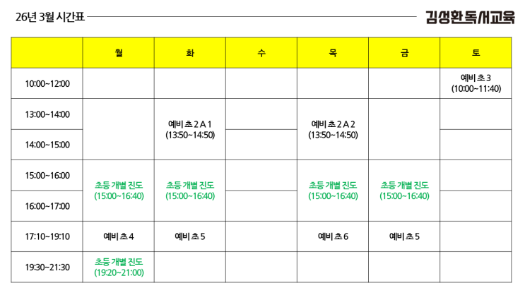 부산 사직동 독서논술, 국어 전문 김성환 독서교육 '26년 3월' 시간표 안