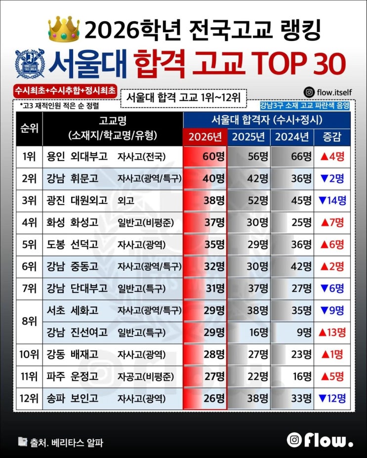 26년도 서울대 입학 상위 30개교 입니다. 과학고는 제외한 순위입니다. #26년 #영어시험 #중등영어 #고등영어 #내신영어 #수능영어#정시영어 #수시영어 #중학영어 #1등급영어 #여명중영어 #거성중영어 #이사벨중영어 #거제여중영어 #사직여중영어 #동래고영어 #동인고영어 #이사벨고영어 #사직고영어 #중앙여고영어 #사직여고영어 #예비중영어 #거제동영어 #사직동영어 <img src="https://blogthumb.pstatic.net/MjAyNjAyMDhfNSAg/MDAxNzcwNTMzNTYwMTQ1.--WODHzdTsp0EZ42V5Pl-bHp0019RThIJ126vT0Wi-Ug.2wSKt73NBUoAcqKeNJx3NxLiRWcI5XPAXkHEnKtvO84g.JPEG/e6f3b12d8001f00a4717b79c510bafbb4c0b2fbe_20260208100624.jpg?type=s3" />