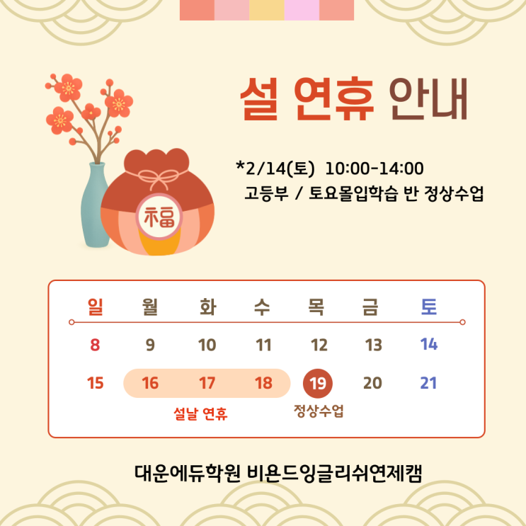 연산동대운에듀학원 비욘드잉글리쉬연제캠퍼스어학원 설연휴안내