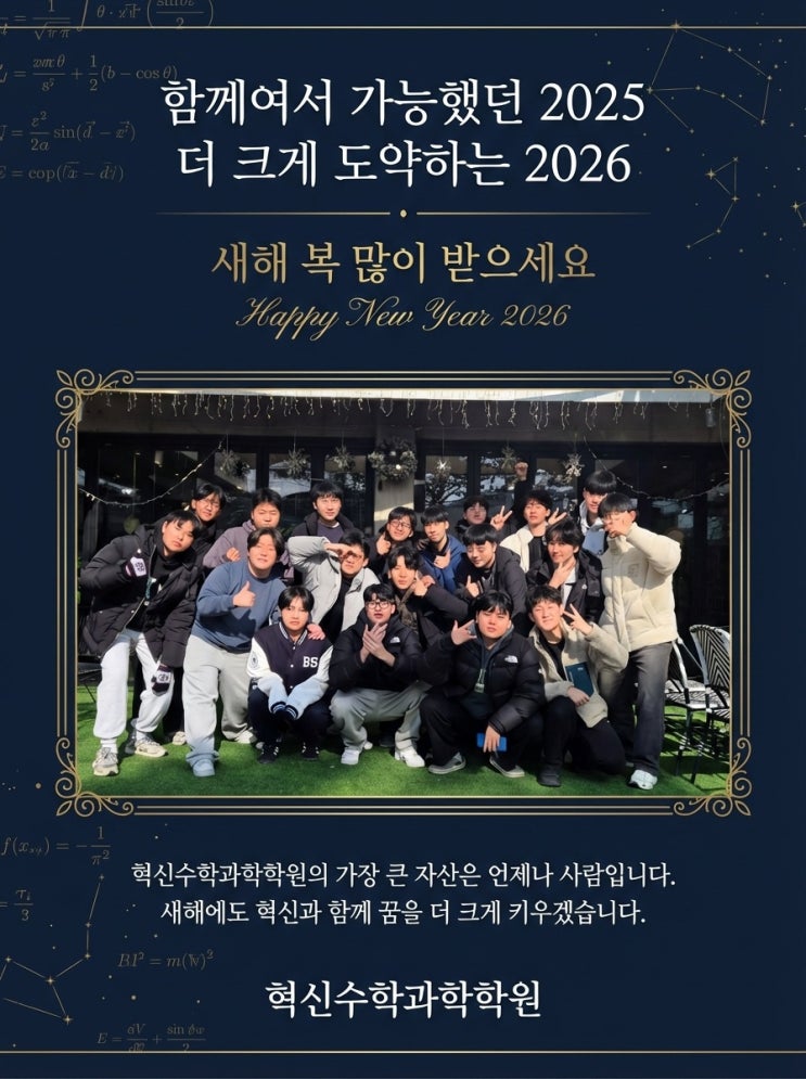 영상을 보며 지난 한 해가 떠올랐습니다. 밝게 웃으며 “새해 복 많이 받으세요”, “혁신 파이팅!”을 외치는 아이들과 선생님들의 모습 속에는 2025년의 모든 시간이 담겨 있습니다. 한 해 동안 우리는 함께 배우고, 함께 고민하고, 함께 성장했습니다. 그 시간들이 모여 오늘의 혁신을 만들었습니다. 혁신수학과학학원의 가장 큰 자산은 건물도, 숫자도 아닙니다. 아이들의 눈빛, 선생님들의 헌신, 그리고 서로를 믿고 함께 걸어온 공동체의 힘입니다. 그 진심이 있었기에 2025년이 가능했습니다. 이제 2026년입니다. 지난 시간의 경험은 디딤돌로 삼고, 더 단단한 준비와 더 깊은 책임감으로 한 걸음 더 도약하겠습니다. 아이들의 가능성을 끝....... <img src="https://blogthumb.pstatic.net/MjAyNjAyMTdfMjQz/MDAxNzcxMjk4MTMyMDg4.UgbkqYG3F51pPBwB6ZUacIjb2wgZxv4qg8mSpGgDZQcg.rFEZ81RuHX2aSP-yiR7_i-HoF0ofjAJ_AIJ-fv5_Icsg.JPEG/IMG%A3%DF4383.JPG?type=s3" />