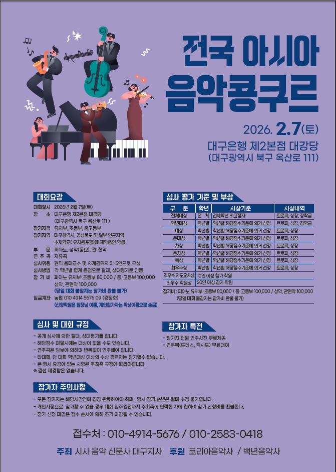 학년대상 수상자 김*주(매호초1) 황보*연(신당초3) 이*희(옥곡초5) 대상 수상자 추*리(중앙초1) 추*미(중앙초3) 김*윤(정화중2) 장*연(삼성현중3) 장*은(삼육고1) 김*희(사동고2) 아이들의 음악은 특별한 순간보다 매일의 꾸준한 연습 속에서 만들어집니다. 이번 전국 아시아 음악콩쿠르에서는 그러한 시간이 얼마나 단단한 결과로 이어질 수 있는지 분명하게 확인할 수 있었습니다. 참가한 학생 전원이 대상을 수상했고, 그중에서도 학년 최고점 입상자가 세 명이나 배출되었습니다. 아주 많은 학생들이 참가하는 이러한 무대에서 이와 같은 결과는 결코 흔한 일이 아닙니다. 더 의미 있었던 점은 이 성과가 일부 오래 준비한 학생들만....... <img src="https://blogthumb.pstatic.net/MjAyNjAyMTBfMjEg/MDAxNzcwNzI2ODM4MTEz.8Fd8uJDjWNW-J6m8lYySv63anQwpj2kZSYQZIt1lsOAg.GKzOE87Kzhuyhw_DX355Oo6eG1ly6GGLE1_vQdTxh08g.PNG/0512191043434041677251.png?type=s3" />