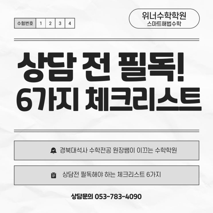 상담 전 필독! 우리 아이 수학의 해답을 찾는 6가지 체크리스트 위너수학을 만나 너의 수학 인생이 10원어치라도 발전하는 내일이 되기를! 안녕하세요! "위너수학을 만나 너의 수학 인생이 10원어치라도 발전하는 내일이 되기를!" 매일매일 아이들의 인생에서, 그리고 수학에서 진정한 위너(Winner)가 될 수 있도록 열정을 다해 지도하는 지산동 위너수학(스마트해법)의 러블리영쌤입니다. 감사하게도 학원에 대한 입소문을 듣고 상담 문의를 주시는 학부모님들이 참 많습니다. 귀한 시간을 내어 문의해 주시는 만큼, 상담 시 가장 많이 궁금해하시는 학원의 핵심 시스템과 운영 방식을 한눈에 보실 수 있도록 명쾌하게 정리해 드립니....... <img src="https://blogthumb.pstatic.net/MjAyNjAyMjFfMTc3/MDAxNzcxNjYxMzEwNDc3.ptguLipHLsDrVl5EHE9wHEj1Xyu2Mav6-gQcWePnwgUg.i4MiWyLotpPH9ES8tSNhLNvdlGEhuYJJG-q9CsnH7HEg.JPEG/%C1%A6%B8%F1%C0%BB-%C0%D4%B7%C2%C7%D8%C1%D6%BC%BC%BF%E4_-010.jpg?type=s3" />