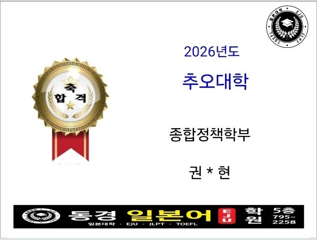 축)2026년 추오대학 종합정책학부 권*현 **추오대학 (中央大学, Chuo University) – 정책학부(총합정책학부 / Faculty of Policy Studies) 개요 츄오대학 *정책학부(총합정책학부)*는 1993년 설립된 학부로, 복잡하고 다양한 사회 문제를 해결할 수 있는 역량을 갖춘 인재를 기르는 것을 목표로 하고 있습니다. 이 학부는 정책 과학과 문화/지역 연구를 통합하는 다학제적 교육을 제공합니다. 위치: 도쿄도 하치오지시 다마 캠퍼스 (Tama Campus) 학부 구조 및 전공 정책학부는 크게 두 가지 학과로 구성되어 있어요: 1) 정책과학과 (Policy Sciences) 정치, 법, 경제, 사회, 경영 등 다양한 사회과학적 시각으로 현실의 문제를....... <img src="https://blogthumb.pstatic.net/MjAyNjAxMjhfNTgg/MDAxNzY5NTc5MjE5Nzkw.lFvVsibJZQkoMom3Y1vstA9gFM3K9RBGjoEbZTOhdhog.6Qf9VXoxVpORXFlm2FMOUphHaoao8zb-ehYBq_-FBfkg.JPEG/1769578913440.jpg?type=s3" />