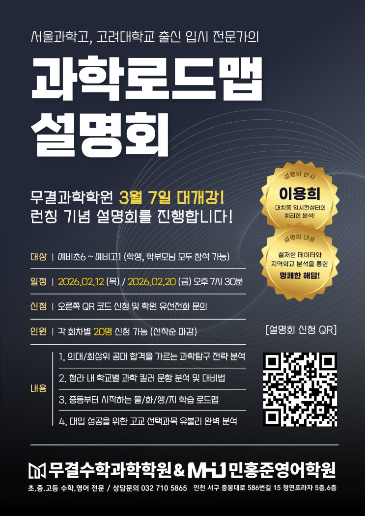 안녕하세요. 청라 입시의 기준, 무결학원입니다. 과학 학습은 학년이 올라갈수록 학습 방식과 전략에 따라 결과 차이가 크게 벌어지는 과목입니다. 무결과학을 개원하며 청라 지역 입시 환경을 반영한 과학 학습 방향과 중·고등 학습 로드맵의 핵심을 드리고자 과학 로드맵 설명회를 준비하였습니다. 무결과학 설명회에 보내주신 많은 관심과 성원에 힘입어 설명회 좌석이 빠르게 마감되었습니다. 이에 따라 추가 좌석을 오픈하게 되었습니다! 무결과학학원 개원 기념 과학 로드맵 설명회 설명회 상세 정보 ✅ 주제: 의대, 최상위 공대 과학 로드맵 (무결의 관리 시스템과 과학 콘텐츠의 만남) ✅ 대상: 의대 및 이공계열 진학을 목표로 하는 예....... <img src="https://blogthumb.pstatic.net/MjAyNjAyMDlfMjUw/MDAxNzcwNjIzODc0ODcx.IxE014-7DIwKaP6oYho8ZNTLfFIJcqhkAoc3NJbcxREg.MKXjIlkkVz_yBQzihZZYKma35LWpwJbI74X-UqWJjZMg.JPEG/%B9%AB%B0%E1%B0%FA%C7%D0-%BC%B3%B8%ED%C8%B8-001.jpg?type=s3" />