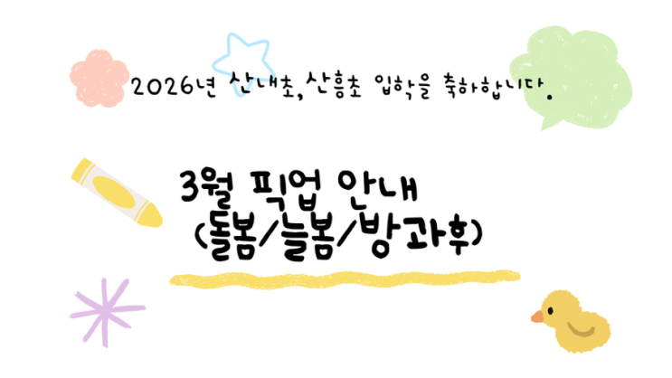 실력이 자라는 음악교육 서윤영 음악학원 입니다:) 어느덧 예비초 아이들의 입학식이 일주일앞으로 다가왔어요 모두들 입학식 준비는 잘 되어 가고 있나요?? 오늘은 예비초 아이들을 위해 산내초/산흥초등학교 픽업 시간을 안내해 드릴게요 3월 3일 입학식에서는 아이들이 강당에 모여 간단한 학교 일정과 함께 각 교실로 이동해 담임선생님과 만남을 갖게 되요. 처음 학교생활이라 얼마나 긴장이 될지.. 선생님이 잘 알고 있답니다☺️ 그러나 걱정 말아요~!! 1학년 입학식후 맞벌이 부모님들을 위해 안전하게 하교 해서 학원에서 수업후 각 가정으로 귀가하도록 저희 #서윤영음악학원이 철저히 준비할테니까요~~!! 산내초등학교의 경우 방....... <img src="https://blogthumb.pstatic.net/MjAyNjAyMjJfOTIg/MDAxNzcxNzM1NTgzMDg0.UhkvTF38JACk9i3caAf5Oeq1556bIrWP4ZW-_PkO-10g.8fQcIwZNUdE8kwERd5xCoG6wrVyL7OLvDoObAtP3UA0g.PNG/IMG%A3%DF3202.PNG?type=s3" />