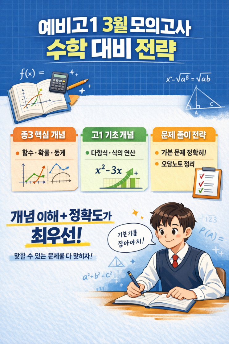 고등학교 입학 직후 치르는 3월 모의고사는 단순한 실력 점검 시험이 아닙니다. 학습 습관, 시간 관리 능력, 문제 해결력까지 고등 수학에 적응할 준비가 되어 있는지 확인하는 시험입니다. 특히 3월 학력평가는 시·도 교육청 주관으로 시행됩니다. 시험 범위는 다음과 같은 특징을 가집니다. 중학교 전 과정 고1 공통수학1 일부(선행을 해두면 유리함.) 계산력 + 개념 이해 + 응용력 종합 평가 선행 속도보다 중요한 것은 ‘기초 완성도’입니다. 1️⃣ 예비고1이 반드시 점검해야 할 핵심 영역 ✔ 중3 수학 완성도 점검 3월 시험에서 가장 큰 영향을 주는 단원은 다음입니다. 인수분해 이차방정식 이차함수 확률 도형 고등 수학은 중학교....... <img src="https://blogthumb.pstatic.net/MjAyNjAyMjNfMTY3/MDAxNzcxODUzNzk5Njk4._OZVbo4AvHLeJcV5eRO_wYWVrJyj_HacyQ7IWZt_9qkg.NALbtCcKHn9igEDR4nG4tngNlFOb-AFMDxX2rys3RZEg.PNG/image.png?type=s3" />