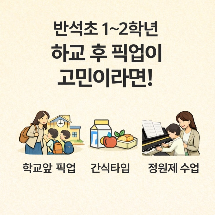 반석초 1-2학년 부모님들, 요즘 상담 오시는 분들이 가장 많이 하시는 말입니다. “학원은 보내고 싶은데… 하교 후가 제일 걱정이에요.” ✔ 방과후 시간이 매번 다르고 ✔ 돌봄 끝나는 시간도 다르고 ✔ 부모님 퇴근은 늦고 그래서 어뮤즈는 단순한 피아노학원이 아니라 하교 이후의 시간을 함께 관리하는 공간입니다. 1. 반석초 교문·돌봄교실 직접 픽업 • 학교 교문 앞 또는 돌봄교실로 직접 픽업 • 방과후 시간이 달라도 원하는 시간 맞춤 대기 • 아이 혼자 이동하지 않습니다 “몇 시에 끝나요?” 그 시간에 맞춰 기다립니다. 반석초 도보권 위치라 더욱 안전합니다. 2. 등원 즉시 확인 문자 발송 아이 도착 후 부모님께 바로 등원....... <img src="https://blogthumb.pstatic.net/MjAyNjAyMjBfMTcz/MDAxNzcxNTYzMjc3MzE0.1l2XzoWw7-BicYr6KRGnnWddacChxAgU91kIde2EcEwg.lGfmfGM-gLryOI6ky_FBXMvRHK4IPBxew9QO-R6i0M4g.JPEG/DE814205%A3%ADC5FE%A3%AD45EE%A3%ADB6B8%A3%ADAF80B0ED3F45.jpg?type=s3" />