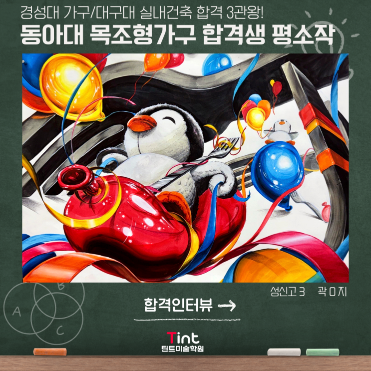 안녕하세요, 오늘 포스팅할 내용은 울산틴트미술학원 동아대 목조형가구디자인 수시합격생 인터뷰내용입니다. [경성대 가구/대구대 실내건축 합격 3관왕!!] Q.출제문제를 읽고 어떻게 풀어 나갔나요? A.시험 전날 풀어보았던 문제가 시험에 출제되어 놀랐지만 형태 연습을 충분히 해두었기 때문에 당황하지 않고 차분하게 문제를 분석하며 접근하였습니다. 문제에서 요구하는 조건과 핵심 요소를 빠르게 파악한 뒤, 연습 과정에서 익혀 둔 형태 구성 방법을 떠올리며 전체적인 구도를 먼저 잡아 나갔고, 이후 세부적인 요소들을 하나씩 정리하며 완성하였습니다. Q.합격의 주요인이 무엇이라 생각하나요? 동아대학교 실기대회 당시 교수님 평가에....... <img src="https://blogthumb.pstatic.net/MjAyNjAxMDZfMjMy/MDAxNzY3NzAzNzQ1NzE5.xtcRHWiqfAGivMvApPSMZrbwz3yv8TavZ6RT_0R5p_Eg.gB2MpZIA-JUjUljBcqXxrL7-EXcggkucuMX-gOWmWDkg.PNG/%B5%BF%BE%C6%B4%EB%C0%CE%C5%CD%BA%E4_%281%29.png?type=s3" />