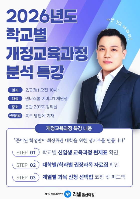<예비 고1, 고등학교 시작 전에 꼭 알아야 할 이야기, 2026학년도 학교별 개정 교육과정 분석 특강 후기> 안녕하세요 서연고·의치약 전문과 러셀 울산 학원입니다. 고등학교 입학을 앞둔 예비 고1 학생들에게 많이 들리는 질문들이 있습니다. 과목 선택 잘못하면 불리하다던데… 어떻게 골라야 하죠 생기부랑 입시는 언제부터 준비해야 하나요 막연한 불안 대신, 정확한 정보와 방향을 잡아주기 위해 이번 겨울, 러셀 울산이 특별한 입시 특강을 진행했습니다. 특강 안내 ✔ 일시 : 2월 9일(월) 오전 10시 ✔ 장소 : 러셀 울산 학원 본관 201호 ✔ 대상 : 윈터스쿨 예비 고1 재원생 ✔ 연사 : 전선우 원장님 신청자 전원이 참석....... <img src="https://blogthumb.pstatic.net/MjAyNjAyMTNfMTI5/MDAxNzcwOTQ3ODMwNDE5.K1rih4GRgFudMwZGqXte6ayYM9ZBHuA-PdG1tMVIN_gg.Z3MLbOHmGnYgaLEgiZ2JiUdWR5CJzy4Ng0oxhNH23Mwg.PNG/image.png?type=s3" />