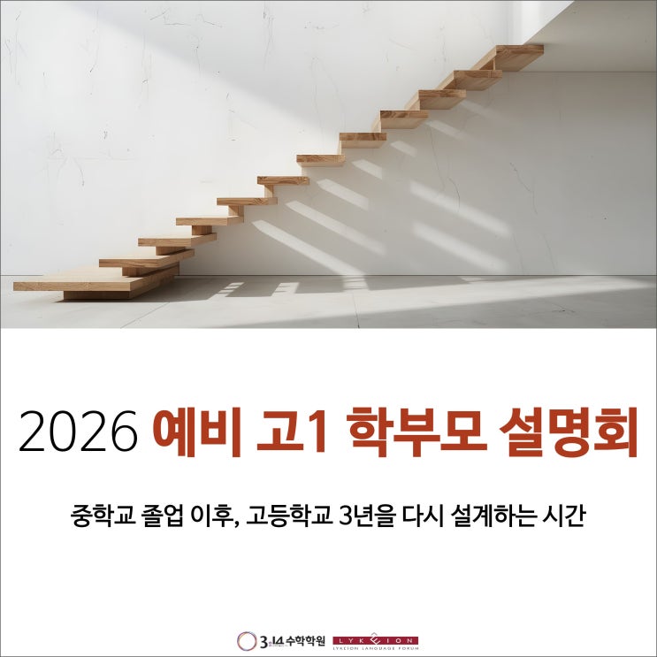 2026년 2월 예비 고1 학부모 설명회 부모에서 학부모로, 아이의 고등학교 3년을 다시 설계하는 시간 안녕하십니까, 리케이온 교육 · 3.14 고등수학입니다. 지난 2월 4일(수)과 5일(목) 양일간 저녁 7시, 예비 고1 학부모님들을 모시고 「부모, 학부모가 되다」라는 주제로 고등학교·대입 설명회를 진행했습니다. 중학교 졸업과 동시에 아이는 고등학생이 되고, 그 순간 부모 역시 자연스럽게 ‘학부모’라는 새로운 역할을 맞이하게 됩니다. 이는 단순히 학교 단계가 올라가는 변화가 아니라, 아이의 학교생활을 바라보는 시선, 학습 관리 방식, 진로를 함께 고민하는 깊이까지 전반적인 기준이 달라지는 전환점입니다. 이번 설명회는 이러한 변....... <img src="https://blogthumb.pstatic.net/MjAyNjAyMDlfMjYy/MDAxNzcwNjE0MzQxMzM2.xlDJnHbI8Zhy6uoSUbayYnRwF6p2mm1XJed8l4dMzi0g.0h9-QFV63wLFoktvdU5RCTafYFMwkYb5LDfMALCr5T0g.JPEG/%C1%A6%B8%F1%C0%BB_%C0%D4%B7%C2%C7%D8%C1%D6%BC%BC%BF%E4._%281%29.jpg?type=s3" />