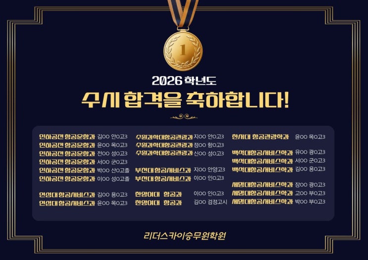#인하공전항공운항과합격 #인하공전합격후기 2026학년도 항공과 수시합격 축하해요. 우리 안양 수원승무원학원 리승이들 소수정예 인원으로 정말 선방했네요. 모두 수고 많았습니다! 항공과 정시만 남겨두고 있는데요, 정시 준비하시는 수험생들 모두 합격을 기원합니다. 2026학년도 수원승무원학원 리더스카이 인하공전 항공운항과 합격생들의 스팩과 준비과정을 살펴볼까요? 인하공전 항공운항과 합격생 스팩과 합격후기 ★인하공업전문대학 항공운항과 합격생 후기★ 고등학교 3학년이 돼서 학원을 등록했는데 처음엔 어떻게 해야 할지 하나도 몰라서 많이 불안하고 걱정되었습니다. 선생님들께서 기초부터 자세히 알려주셔서 준비 방향을 잡....... <img src="https://blogthumb.pstatic.net/MjAyNjAxMDhfMjE2/MDAxNzY3ODU1NzMxNTcy.SkLKGQuglSOvooS0G24xU0P8bdteF0qZZj4XQ_FWeY8g.FNfWYo50nNAuwXxC789GmlYTh9VB6qjwCiQUFOYNIGog.JPEG/%C0%CE%C7%CF%B0%F8%C0%FC%C7%D7%B0%F8%BF%EE%C7%D7%B0%FA%C7%D5%B0%DD.jpg?type=s3" />