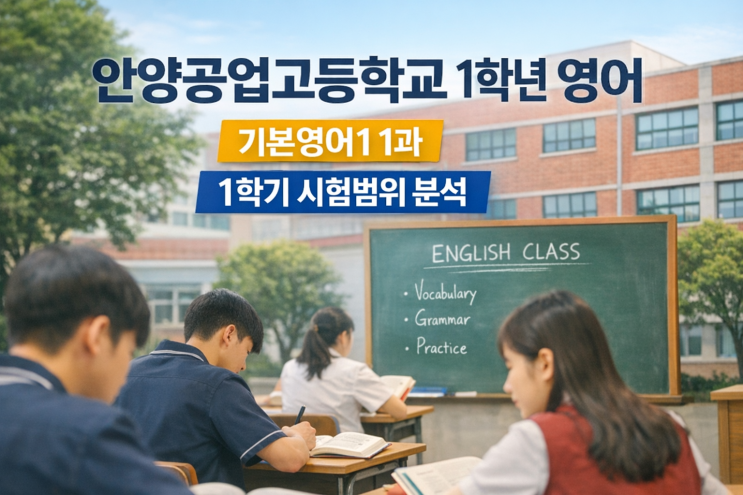 안양공고 1학기 시험범위, 반드시 짚고 가야 할 첫 단원 안양공업고등학교 1학년 학생들이 고등학교에 입학해 처음으로 치르게 되는 영어 시험범위가 바로 기본영어1 1과입니다. 이 단원은 단순히 교과서의 첫 페이지라는 의미를 넘어, 안양공업고등학교 1학년 영어 내신이 어떤 방식으로 출제되는지를 처음으로 보여주는 기준 단원입니다. 지문을 어떻게 읽어야 하는지 문법은 어떤 형태로 출제되는지 단어·숙어는 어느 수준까지 요구되는지 이 모든 것이 기본영어1 1과에 압축되어 있습니다. 그래서 이 단원을 어떻게 공부했느냐에 따라 1학년 1학기 영어 성적뿐 아니라, 이후 고등학교 영어 학습의 방향까지 크게 달라질 수 있습니다. 1. 안양....... <img src="https://blogthumb.pstatic.net/MjAyNjAxMDlfMTUw/MDAxNzY3OTM4NjI4OTIx.02-tjryOcBAhBt-vXh15zr-_n76pG5gLt8g-ykbe_5sg.YUr9rbHlZ8Z8SFzIjqNOUcC5ohcktrmpBPYOck4xWp8g.PNG/%BE%C8%BE%E7%B0%F8%B0%ED%B1%E2%BA%BB%BF%B5%BE%EE1.png?type=s3" />