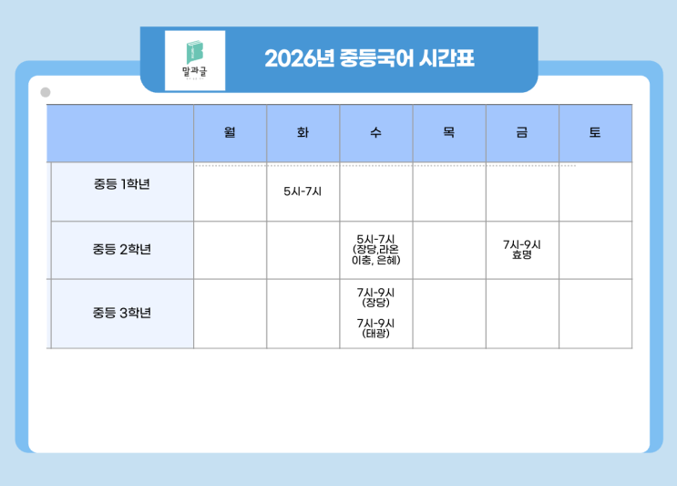 긴긴 겨울방학이 끝나고 이제 다음주면 새로운 학기가 시작됩니다. 많이들 문의 주셨던 중등부 국어 교과 수업 시간이 확정되어 안내드립니다. 첨부된 이미지의 시간표를 참고해주세요. 중등부 국어 교과 수업과 논술 수업은 다릅니다. 논술 수업은 다양한 관점의 글을 읽고 근거를 들어 자신의 생각을 이야기 하고 글을 쓰는 수업입니다. 지필평가보다는 수행평가에 조금 더 유리한 수업이고요. 국어 교과 수업은 국어과에서 필요한 개념을 숙지하고 문제를 해결하는 능력을 키워내는 수업입니다. 문학에서의 개념, 문제를 해결하는 방법 문법 개념, 문제풀이 교과서의 글을 읽어내는 연습 등을 하게 됩니다. 혼자 공부해서 국어과의 개념을 잡....... <img src="https://blogthumb.pstatic.net/MjAyNjAyMjNfMTEg/MDAxNzcxODIwNzczNzE4.3ODAleuRlTD9AuoKEJtqalPUDUEOET4CPydVkKRN8_kg.gIIqsaBbghYT5INTOe6fTiHj6u61jsP2jbYKowbMs1wg.PNG/%C1%DF%B5%EE%B1%B9%BE%EE_%BD%C3%B0%A3%C7%A5%282026%3A3%BF%F9%29.png?type=s3" />