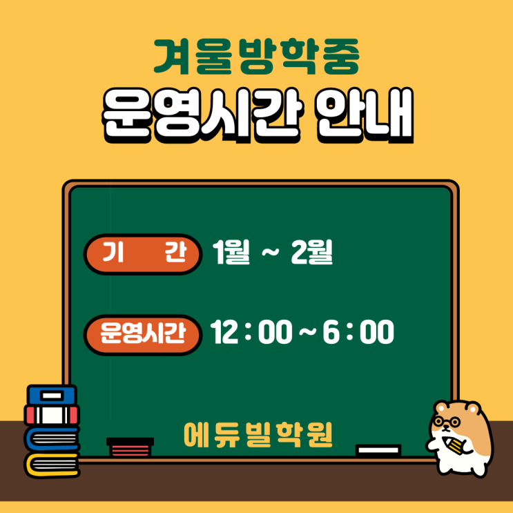 안녕하세요, 에듀빌학원입니다. 곧 다가올 겨울방학 동안 학원 운영시간에 대해 안내드리려고 합니다. 기간 : 2026년 1월 ~ 2월 운영시간 : 12:00 ~ 6:00 겨울방학 동안 학습은 다음과 같이 진행합니다. 수학교실 : 다음 학기 예습을 진행합니다. 영어교실 : Level 별 학습을 기존과 같이 진행 논술교실 : 기존 학습과 함께 특강을 진행 더불어 겨울방학 동안 아이들의 등원 시간을 취합하고자 합니다. 위 이미지를 클릭하시고 안내에 따라 희망하시는 등원 시간을 알려주세요~ 아이들이 한 시간대에 너무 몰리면 학습 질이 떨어질 수 있어 미리 조율하려는 것이니 잠시만 시간을 내어 참여 부탁드립니다 또한, 개인 사정으로 시간 변....... <img src="https://blogthumb.pstatic.net/MjAyNTEyMDVfOSAg/MDAxNzY0OTI0OTAwNjIx.oexj-FYh1kbsYUnT0uGE9F_mjbS0pFCge6t7TxdYmVkg.yJSyXhtzn6VMYFUUQzk1kx5zUKM_8ZYLa93ryLJe3KMg.PNG/%C1%A6%B8%F1%C0%BB-%C0%D4%B7%C2%C7%D8%C1%D6%BC%BC%BF%E4_-001.png?type=s3" />