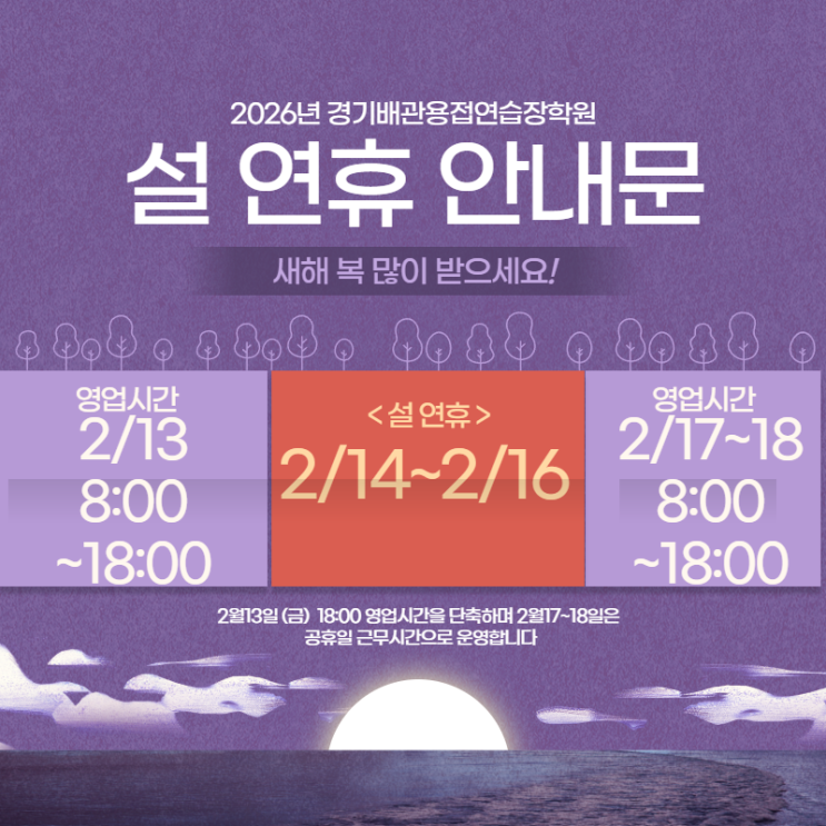 안녕하세요 경기배관입니다 이번 설날은 유난히 빠르게 느껴지네요 날씨가 점점 풀리나 싶더니 다시 많이 추워졌습니다 집에 방문하실 때는 따뜻하게 챙겨 입고 가셔야겠습니다 경기배관의 최사장과 직원들도 명절동안 가족들을 만나고 충전된 상태로 다시 이어갈 예정입니다 2월 13일 금요일에는 오전 8시에서 오후 6시까지 연습장이 운영될 예정이며, 설날연휴인 화요일 수요일(17일~18일)에는 평소 주말과 똑같이 오전8시에서 오후 6시까지 운영될 예정입니다 2월 13일 금요일 오전 8시 ~ 오후 6시 2월 14일 토요일~ 2월 16일 월요일 휴무 2월 17일 화요일 2월 18일 수요일 오전 8시 ~ 오후 6시 연습장 이용에 차질이 없도록 공지 내용 참고부....... <img src="https://blogthumb.pstatic.net/MjAyNjAyMDlfMjcx/MDAxNzcwNjE0NzcxNTUz.WBUBbEhqSdG52kyuORPhYqbBxwqXhomeluRK7eNqO6kg.CXUW3TcABY4LutWBoe1KOq7xbVeghNVmfArwcOpMalEg.PNG/%3F%84%A4%3F%82%A0%3F%97%B0%3F%9C%B4.png?type=s3" />