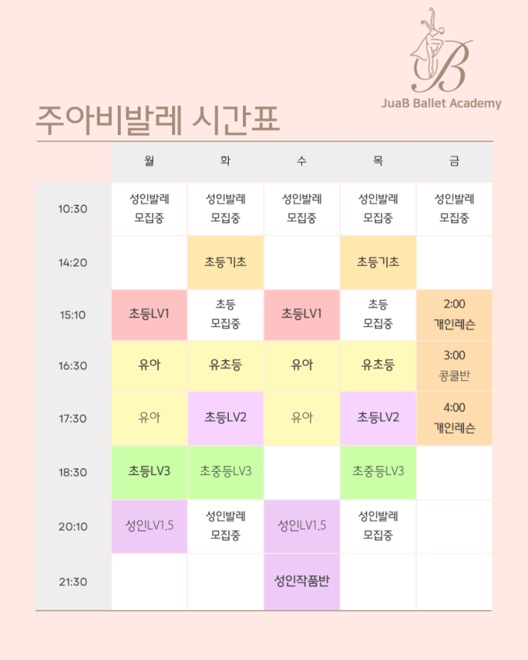 안녕하세요 주아비발레학원입니다. 3월부터 적용되는 시간표입니다. 모집중인 반은 3명 이상시 개설 가능합니다. 무료체험수업도 가능하시니 언제든 문의주세요♡ ✅️ 무료체험수업 ✅️ 차량운행중 ✅️ 주차가능 ⚘️교육문의 ☎️ 010.6430.1990 방문상담 시 사전에 예약부탁드려요 <img src="https://blogthumb.pstatic.net/MjAyNjAyMjVfMjg5/MDAxNzcyMDA2OTQ2MTUw.jt_fqK4vKj4lWAcSWB89EUxZe8wA-CU0sMJ4StWKEjwg.632QNiB1g8KOzi7WIpPVx86q_PzMqGE9YzZ4OoCPd-Eg.PNG/900%A3%DF1772006905217.png?type=s3" />