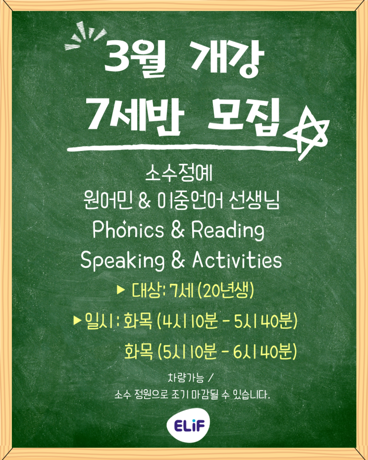 식사동 7세영어, 3월 신규반, 파닉스부터 스피킹까지 잡는 유치부 영어수업