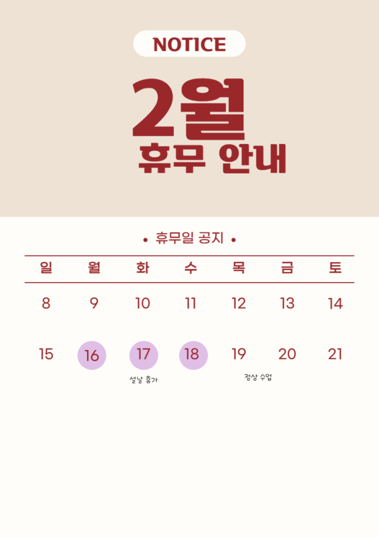 그래이수학학원 2월 설날 휴무 안내