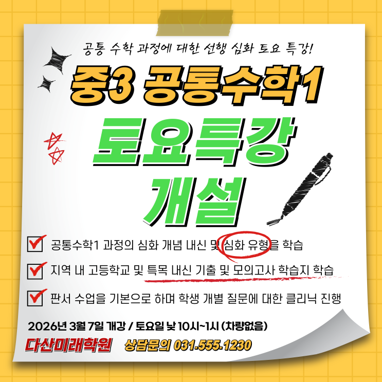 학부모님 안녕하십니까? 중3은 진로와 진학을 준비하는 중요한 시기입니다. 그리고 새 입시제도에서는 고등학교 1학년 과정의 내신이 진학하는 대학의 수준을 결정하는 매우 중요한 요소입니다. 그리고 고교 진학 후 학생들이 공부에서 가장 어려움을 겪는 과목이 수학입니다. 이에 따라 본원에서는 1차적으로 공통수학 과정에 대한 선행 심화 토요 특강을 개설하여 진행 하고자 합니다. 정규수업의 선행수업보다 심화된 과정과 속도로 특강 수업을 진행하여 선행학습에 대한 부모님의 기대와 학생들의 학습 열망에 맞춰 학생들의 미래를 준비하고자 합니다. 안내 사항 강좌명 : 공통수학1 선행 심화 특강 대상 : 중3 학생 개강일 : 2026년 3월 7....... <img src="https://blogthumb.pstatic.net/MjAyNjAyMTlfMzYg/MDAxNzcxNDg2OTc4Mjkw.TnrbfbeFDuklkm676WjTx-RojtTQGytFbrAbbiyZYIwg.l0Im2VH9BrTnoSI_JTDPIriuMCwFZTDknCx5eK7Gbr4g.PNG/%B9%CC%B7%A1%C1%DF3%B0%F8%C5%EB%BC%F6%C7%D01_%C5%E4%BF%E4%C6%AF%B0%AD%28%B9%CC%B8%AE%C4%B5%B9%F6%BD%BA%C1%A6%C0%DB%29.png?type=s3" />