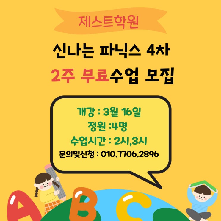 제스트 학원 신나는 파닉스 4차 2주 무료수업 모집 시작합니다~ 1~3차 수업이 빠르게 마감되면서 학부모님들의 추가 문의가 많았습니다. 그래서 준비한 4차 신나는 파닉스 2주 무료체험 왜, 지금 파닉스를 제대로 배워야 할까요? 많은 아이들이 ✔️ 알파벳은 다 아는데 ✔️ 단어를 보면 멈추고 ✔️ 문장을 읽을 때 추측합니다. 이유는 단 하나입니다. ‘읽는 원리’를 배우지 않았기 때문입니다. 파닉스는 단순히 알파벳 이름을 아는 수업이 아닙니다. 소리의 규칙을 이해하는 수업입니다. 파닉스를 제대로 배우지 않으면 생기는 문제 단어를 외워서만 읽습니다. 모르는 단어가 나오면 멈춥니다. 독해 속도가 느립니다. 읽기가....... <img src="https://blogthumb.pstatic.net/MjAyNjAzMDRfMiAg/MDAxNzcyNjA2MTk4OTk3.k8cbBVcE4_pIbLrvOKVG3LiwEwUvbbMp5FWcaohQuo4g.2VxePNIdgWudra9sKOTYt-jtzg2Z4ZtYzqFs83CjT48g.JPEG/%C1%A6%B8%F1%C0%BB-%C0%D4%B7%C2%C7%D8%C1%D6%BC%BC%BF%E4_-003_%283%29.jpg?type=s3" />
