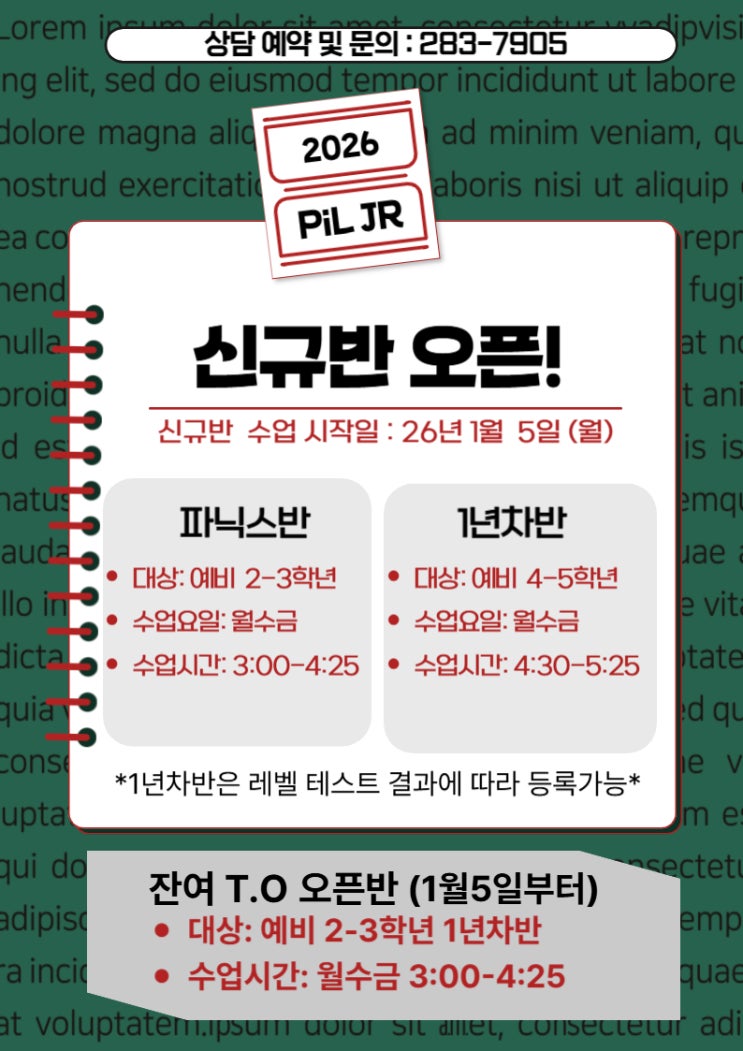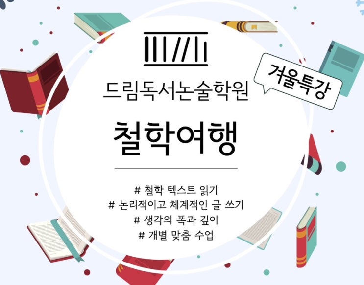 겨울방학특강 생각이 자라는 철학여행 안녕하세요 드림독서논술학원 입니다. 다가오는 겨울 방학, 책을 읽고 끝나는 수업이 아니라 생각하고, 말하고, 글로 정리하는 힘을 키우는 독서·철학 중심 방학특강을 진행합니다. 일정 개강: 2026년 1월 5일(월) 문의: 010-2112-1458 모든 수업은 학생의 연령과 수준에 맞춰 다음과 같이 진행됩니다. ✔ 쉽지만 깊이 있는 질문 ✔ 논리적인 토론 ✔ 체계적인 글쓰기 수업안내 1) 그림책 리터러시 : 생각하고 상상하기 -대상: 초등 2~3학년 -월·화 오전 10:30~12:30 -즐거운 그림책 읽기 + 생각 확장 활동 2) 생각책 읽기: 쉽지만 깊은 철학수업 -대상: 초등 4~6학년 -수요일 오전 10:30~12:30 -토론 훈련....... <img src="https://blogthumb.pstatic.net/MjAyNTEyMTdfMjY0/MDAxNzY1OTI5MzU5MjEz.xnZ7Uady0suSBUu22-a_rmJKIKr1XUYeL89Ni2XBYP8g.Z9H2cH2UNV5UVff1qfcmsKuxwqE81rM04js60-DSOUsg.JPEG/output%A3%DF3347361079.jpg?type=s3" />