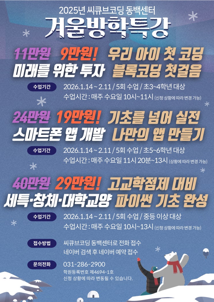 코딩 첫걸음 : 매주 수요일 10시 ~ 11시 코딩을 처음 배우는 예비 초3, 4학년들을 위한 블록코딩 기초 과정. 초등교과과정에서 배우게 되는 엔트리를 사용하여 코딩이란 무엇인지 알아보는 과정입니다. 주1회 1시간씩 총 5회 수업, 수강료 9만원 (11만원에서 약 20% 할인) 스마트폰 앱 만들기 : 매주 수요일 11시 20분 ~ 13시 기초를 넘어 실전으로 들어가는 예비 초5, 6학년들을 위한 스마트폰 앱 개발 과정. 앱인벤터를 사용하여 나만의 앱을 만드는 능력을 키우는 과정입니다. 주1회 1시간 40분씩 총 5회 수업, 수강료 19만원 (24만원에서 약 20% 할인) 파이썬 기초 완성 : 매주 수요일 10시 ~ 13시 단 5회의 수업으로 파이썬 기초를 완성하는....... <img src="https://blogthumb.pstatic.net/MjAyNTEyMTdfMjAy/MDAxNzY1OTUwNDYwODY2.bdYezqpnzB0Hv2oWocQ5-MiGq8aIiBBtSGZFoYrwttgg.3kiylAdNkmdseMCVUQlqFyeBvjwWceFMb1A-D_pejhog.JPEG/2025_%B0%DC%BF%EF%B9%E6%C7%D0%C6%AF%B0%AD_A4-001.jpg?type=s3" />
