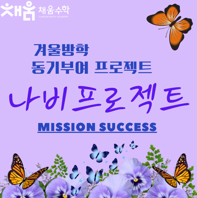 '나비 프로젝트'는 학생들이 애벌레가 나비가 되듯, 방학 동안 학습 습관과 실력의 괄목할 만한 성장을 이루도록 돕기 위해 기획한 프로그램입니다. 이 프로젝트의 핵심은 공부의 가장 기본적인 자세인 '출석'과 '숙제 완성도'에 대한 철저한 관리와 동기 부여에 있습니다. 채움수학에서 '나비 프로젝트'를 기획하게 된 가장 큰 이유는 바로, 학생들이 이처럼 중요한 겨울방학을 얼마나 알차고 의미 있게 보낼 수 있을지에 대한 깊은 고민 때문이었습니다. 방학이 그저 흘러가는 시간이 아닌, 실질적인 성장과 도약의 시간이 되려면 학생들에게 강력하고 지속적인 동기 부여가 필수적이라는 결론에 도달....... <img src="https://blogthumb.pstatic.net/MjAyNTEyMjFfMTA3/MDAxNzY2MjQzMzkwMjk2.OlneysrTbkXfsuJuKmAakz5QhLm77yHLA-6IF5borlkg.tGKxqU4vpAS9s9XXo9u10NrstzIG5nDpKQnjH1fD9-Qg.PNG/c.png?type=s3" />