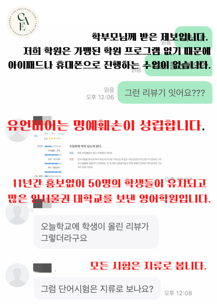 안녕하세요. 용인 동백동 영어학원 CAE 잉글리쉬 원장 김태연 입니다. 다름이 아니라 오늘 제가 학부모님께 한 제보를 받았는데요! 굉장히 당황스러운 상황의 이야기였습니다. 저희 학원은 제가 1인 설립자로, 11년간 동백동에서 홍보없이 매년 40명 이상의 학생들이 공부를 하고 있습니다. 더욱이 저희 학원은 큰 강의실 3곳에서 아이들이 공부하고 있고, 환기가 너무나도 잘되는 쾌적한 환경입니다. 저희 영어학원에서는 학원에 오면 무조건 휴대폰 및 전자기기를 제출하고 있습니다. 전자기기를 이용한 수업은 전혀 없습니다. CAE는 가맹사업의 영어 프랜차이즈가 아니기 때문에 절대 휴대폰으로 보는 시험이 없습니다. 지류 단어시험 이후, 구....... <img src="https://blogthumb.pstatic.net/MjAyNTEyMTZfMjc5/MDAxNzY1ODU4MTQyMzYz.ZTuNdg5aRfUGUgiDBT2dWF68l6CpHcANAIXknkgbBoIg.gJbExsFmb5IZ9avJvLdkwAseXzXHhaJIwz0rcGPf7N4g.PNG/1.png?type=s3" />