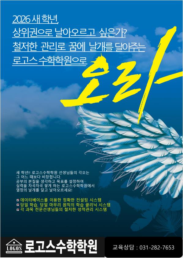 26년 3월3일(화) 신학기 개강!!! 안녕하세요. 로고스수학학원입니다. 새학년 새학기에 대한 커다란 희망을 꿈꾸며 그 희망이 현실이 되기를 바라는 지금!!! 천금의 중요한 시간을 정말로 의미있게 보내야 되겠지요. 2025년 새로운 교육과정이 반영된 한해를 보냈습니다. 변화되는 입시상황 등에 제대로 대응하기 위해서는 입시정보와 함께 누구에게도 뒤쳐지지 않는 실력을 쌓아가는 일이 매우 중요합니다. 알차게 보낸 겨울방학을 바탕으로 2026년 새학년 새학기가 시작되는 3월을 제대로 시작하고, 개학 후에 바로 보는 첫시험을 얼마나 잘 준비를 해서 보느냐가 매우 중요할 것입니다. 수학은 정말 어려운 과목입니다. 대학입시에서도 절대적....... <img src="https://blogthumb.pstatic.net/MjAyNjAyMDJfMTg4/MDAxNzcwMDM1OTU5MDE2.FCCdDlMDVOwpvAlyPUDnZWaGKrvrkFF_PxUnT_F7Wygg.yksxCnvdh8bp9UoBREf9VR6gtce73oVefgyiVAC_XUwg.JPEG/2018%BB%F5%C7%D0%B3%E2%28%C1%BE%C7%D5%29_%BF%C0%B6%F3_-_%BA%B9%BB%E7%BA%BB_%C7%D5%C4%A1%B1%E2.jpg?type=s3" />