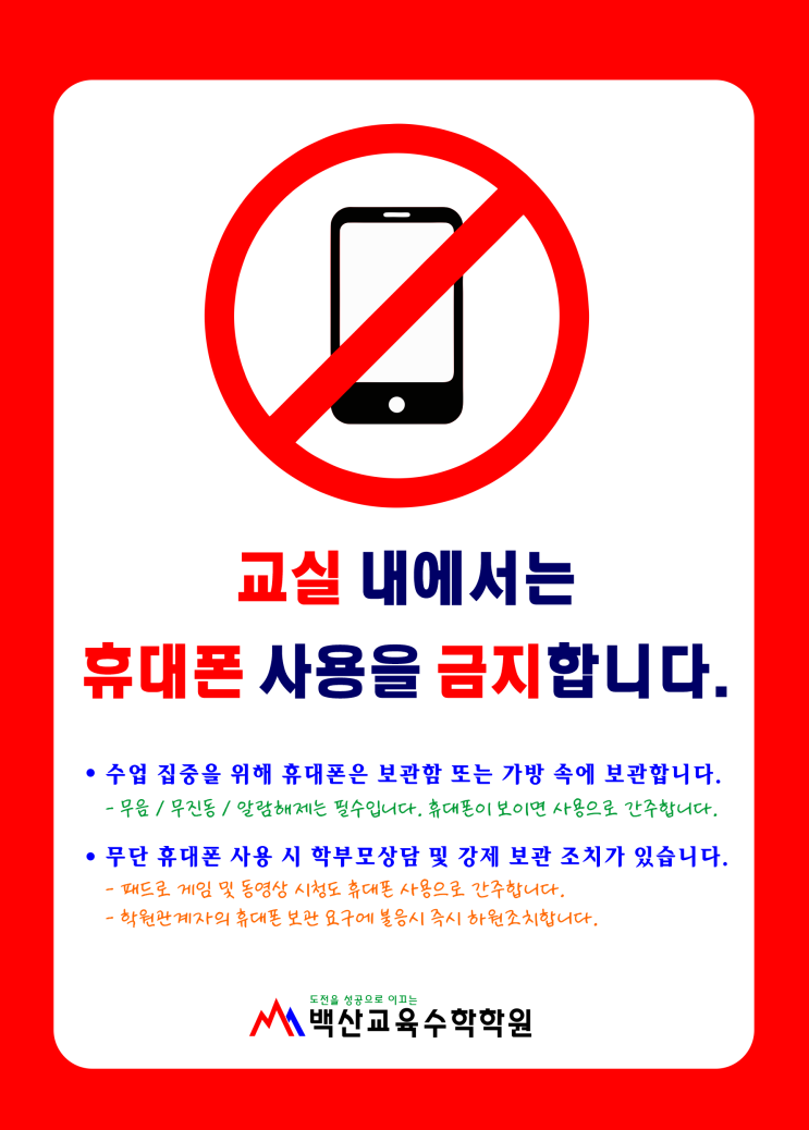 2026년 3월 백산교육수학학원 교실 내 휴대폰 사용금지 전면실시 안내