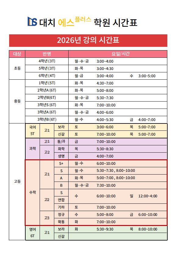 대치 에스플러스 학원 2026년 강의 시간표 안내 안녕하세요. 새로운 이름으로 시작하는 대치 에스플러스 학원입니다. 2026년 새 학기부터 적용되는 전체 강의 시간표를 안내드립니다. 초등부터 중등, 고등까지 학년별·과목별 맞춤 커리큘럼으로 운영되며, 수업 집중도와 학습 효율을 고려해 시간표를 체계적으로 구성했습니다. ■ 운영 대상 초등 / 중등 / 고등 전 학년 수학 · 국어 · 영어 · 과학 과목별 분반 운영 ■ 고등부 운영 특징 내신 대비 + 심화 수업 병행 수준별 반 편성(S+ / S / A / B) 연합·정규·특강 수업 선택 가능 ■ 상담 및 등록 안내 반별 정원제로 선착순 마감됩니다. 현재 학년 및 목표에 맞는 반 배정 상담 후 등록이 진....... <img src="https://blogthumb.pstatic.net/MjAyNjAyMTJfNjcg/MDAxNzcwODg0NDM5OTcx.8GiDrbRn7vR3ITPuH1ytCyVBLqIcIjs1OwNwd0MsNKog.7W1qX8H0qpFySEJvZPsTjelqlW6BqY8TFT_eZ1j14FAg.PNG/image.png?type=s3" />