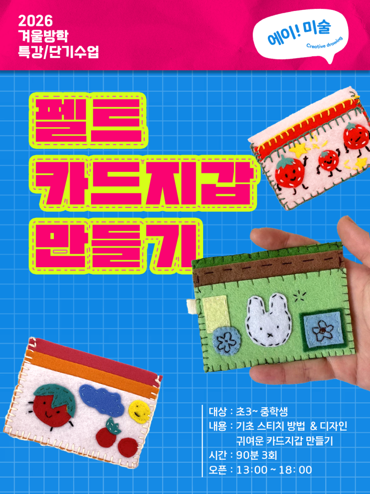 2026년 겨울방학 미술특강 ③ 펠트 카드지갑 만들기 기초 스티치 방법을 연습하고 귀엽고 개성있는 카드지갑을 디자인합니다. 대상 : 초등학교 3학년부터 중학생 시간 : 90분 수업. 3회 기간 : 1월 2일 ~ 2월 27일 오픈 : 13:00 ~ 18:00 (오픈 시간 중,시간선택) 김포 구래동 미술학원 [에이!미술] TTCT 창의력 심리검사 전문가 (2015 ) [에이! 미술]의 수업은 10년간, 아이 성향과 인지· 사고력을 연구하여 개발된 프로그램입니다. 아이들 성향과 인지력에 맞추어 개별적 밀착 관리가 들어갑니다. 예고를 졸업하고 서양화를 전공, 일본에서 디자인을 전공한 원장님이 직접 수업하고 관리합니다. <img src="https://blogthumb.pstatic.net/MjAyNTEyMTNfMjYg/MDAxNzY1NTk4NjgzNTA4.lDVTeCaXILj5BLjSqwnCppmSqWIjB4O8XRzt0pOm0iEg.05e70LimaOZ3ok9n1MFh5NZ6hPKuJzqfk2RElKgYHUsg.PNG/26_%C6%AF%B0%AD_%C1%F6%B0%A9.png?type=s3" />