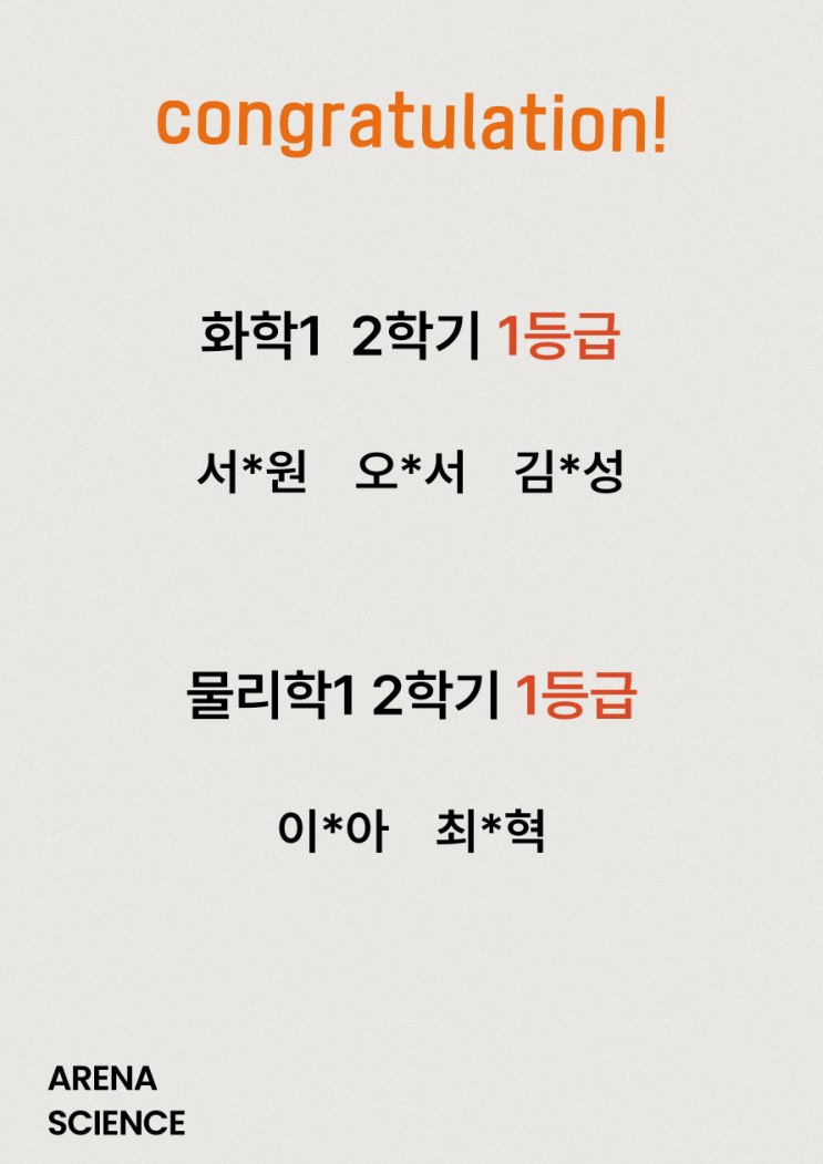 아레나 과학 2학기 최종 1등급 축하합니다.