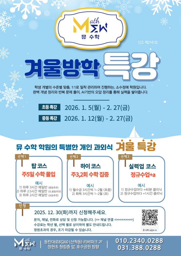 [뮤 수학] 2026년 겨울방학 특강안내 안녕하세요. 뮤 수학 학원입니다^^ 우리 아이들이 또 한 살 성장하는 시기가 왔습니다. 한 해를 잘 마무리하고 더 큰 성장을 이루는 시간이 될 수 있도록 학원도 열심히 돕겠습니다. 다가올 겨울방학도, 알찬 배움과 의미있는 시간으로 채울 수 있도록 최선을 다하겠습니다. 우리 아이들의 방학 스케쥴 검토하실 수 있게 겨울특강을 미리 안내드립니다. ●1월 특강기간● 초등; 1/5(월)~1/30(금) 4주 중등; 1/12(월)~1/30(금) 3주 ●2월 특강기간● 2/3(월)~2/27(금) 약3.5주 * 특강시간 pm1~1시30분 시작 예정 * ● 특강 유형과 기간은 선택가능합니다. (예시) 1. 탑코스, 매일3시간, 1월만 신청 2. 하이코....... <img src="https://blogthumb.pstatic.net/MjAyNTEyMDJfMTg0/MDAxNzY0NjY1NTk5NDcx.s9vAcJEUSuqGgLowbFsfFTjDizztOt7uaVxzVg208Uwg.N4tE13-6UpZKqUX-NkDjjZbD8P2eeZxhxd-v7QD8RGog.JPEG/%C1%A6%B8%F1%C0%BB-%C0%D4%B7%C2%C7%D8%C1%D6%BC%BC%BF%E4_-001.jpg?type=s3" />
