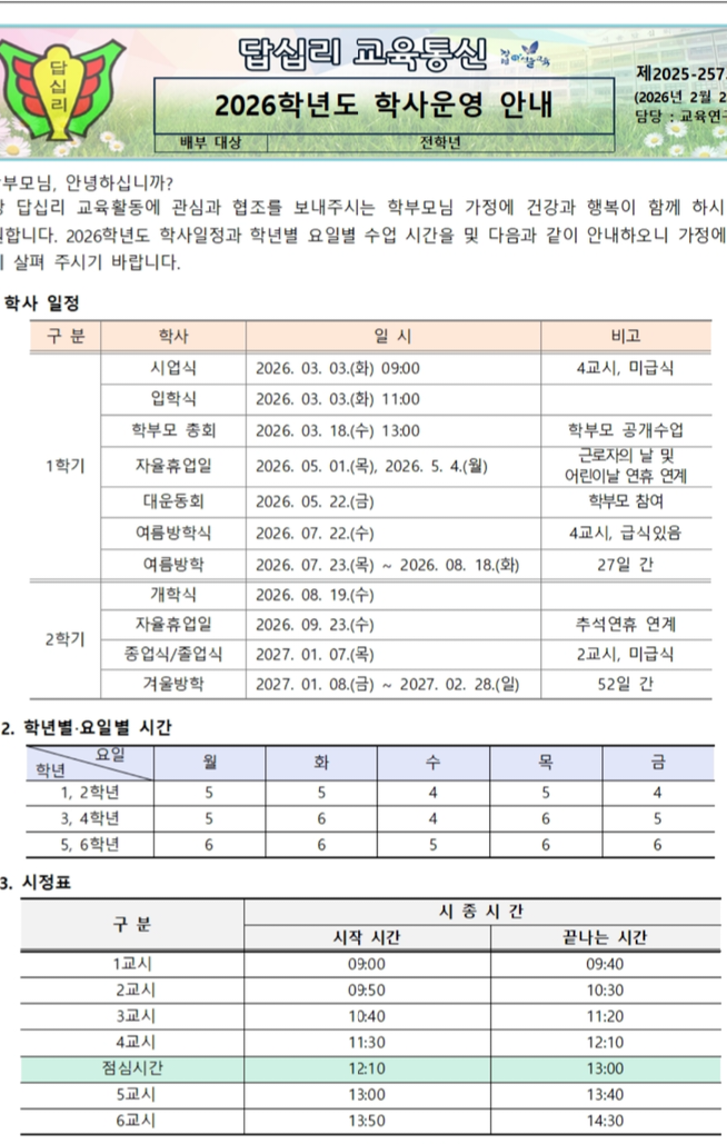 답십리초 국영수 학원 예섬학원 2026년 답십리초 학사운영 안내입니다