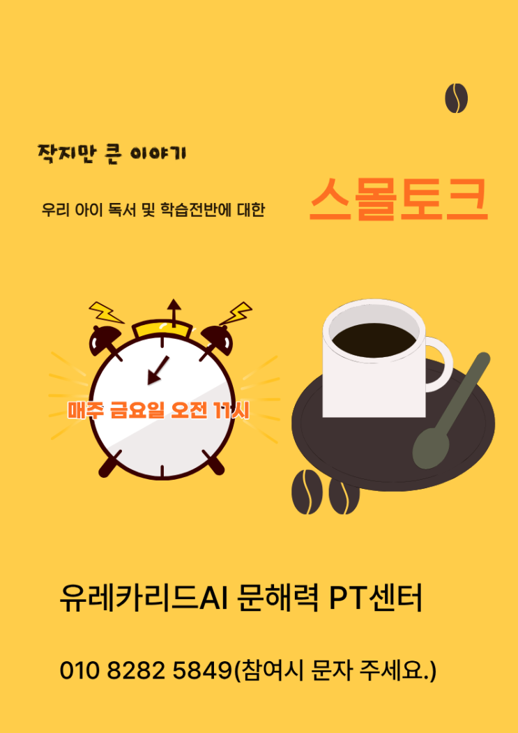 ☕️ 작지만 큰 이야기, 스몰토크를 시작합니다. 학원을 운영하다 보면 “상담은 꼭 문제 있을 때만 하는 걸까?” 라는 생각이 들 때가 있습니다. 성적, 진도, 시험 이야기만이 아니라 ✔ 아이의 독서 습관 ✔ 공부에 대한 태도 ✔ 요즘 아이가 힘들어 보이는 이유 ✔ 학습 전반의 흐름 이런 이야기들은 조금 더 편안한 자리에서 나눌 수 있다면 얼마나 좋을까요? 그래서 유레카리드AI 문해력 PT센터는 학부모님과 함께하는 ‘스몰토크(Small Talk)’ 시간을 마련했습니다. 스몰토크란 무엇인가요? 스몰토크는 ✔ 상담처럼 무겁지 않고 ✔ 강의처럼 일방적이지 않으며 ✔ 질문과 공감이 오가는 소규모 대화 모임입니다. 커피 한 잔을 놓고 아....... <img src="https://blogthumb.pstatic.net/MjAyNjAyMjRfMjAx/MDAxNzcxOTE0MTU5Mjky.HzC3-Y47IE6PpwGxlpZbI5tQJ6IaQEeZesIKxorr89gg.QUIPkha0fs0W7i6nzD_VAib2NA7A1mMv7mCBLudYpH4g.PNG/%BD%BA%B8%F4%C5%E4%C5%A9.png?type=s3" />