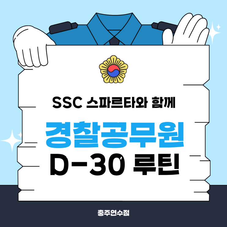 안녕하세요. SSC 스파르타 충주연수점입니다 시험이 D-30으로 다가오면 머릿속은 복잡하고, 마음은 불안해지기 마련입니다. 공부는 하고 있는데, 점수는 늘 제자리 같고 지금 잘 가고 있는 게 맞는지 스스로도 헷갈릴 수 있죠. 이 시기에 가장 중요한 건 혼자 버티는 힘보다 누군가의 관리입니다. SSC 스파르타 충주연수점은 경찰공무원 수험생들이 마지막 한 달을 가장 효율적으로 보낼 수 있도록 시기별 루틴과 맞춤형 관리 프로그램을 제공합니다. “관리가 합격을 만든다” 그 문장이 현실이 되는 순간입니다. SSC 스파르타의 밀도 높은 관리 시스템 마지막 한 달을 좌우하는 건 얼마나 많이 공부하느냐보다 공부의 방향이 내 약점에 맞....... <img src="https://blogthumb.pstatic.net/MjAyNjAyMTBfODAg/MDAxNzcwNzA1MzgwMDM0.wS7jzp0LGeLtbkD28x6KnZNBWrxtxzbJOWxRtyD51zcg.NOXAyOdD_uWUIoDFb03YGB3NkeNzoEUi3A-BX_FCaxAg.PNG/1.png?type=s3" />